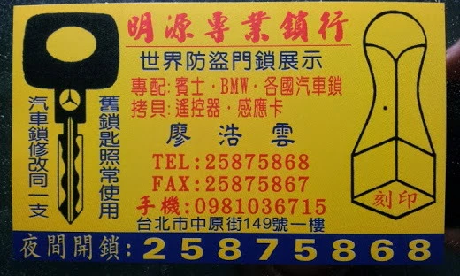明源鎖店創立三十年,目前十餘家門市,本店位於台北市中山區中原街149號1樓。明源鎖店是值得您信賴的店家,若您有開鎖、換鎖、印章類的需求,我們都能替您服務。
